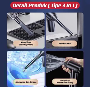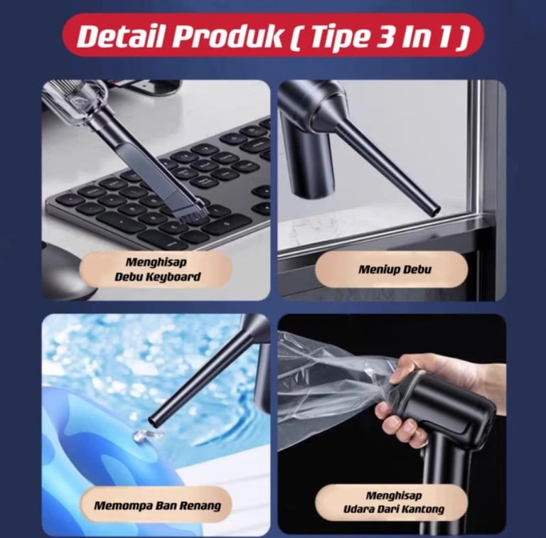 Dilengkapi beberapa jenis kepala untuk berbagai kebutuhan: celah sempit, karpet, meja, boneka, dll.