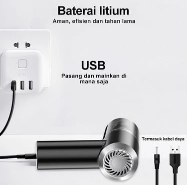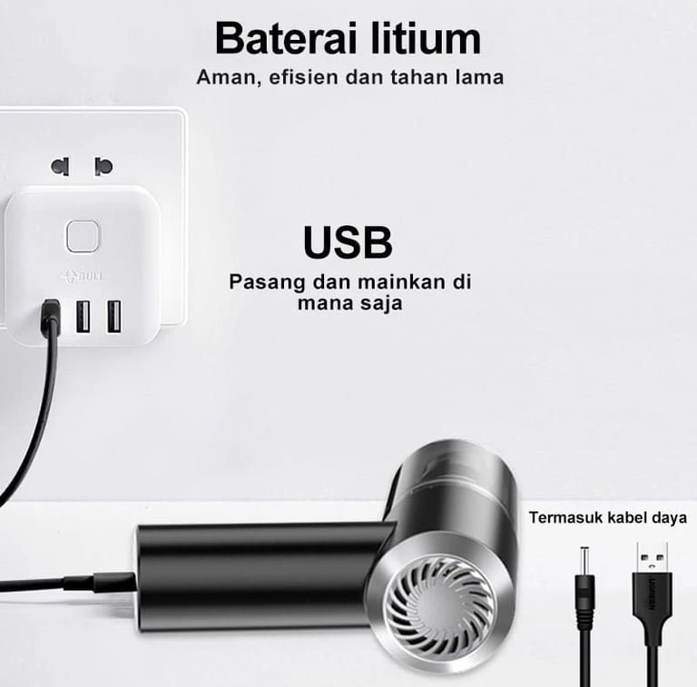 Cas pakai power bank, laptop, colokan mobil, atau charger HP biasa. Bisa dicas di mana saja!